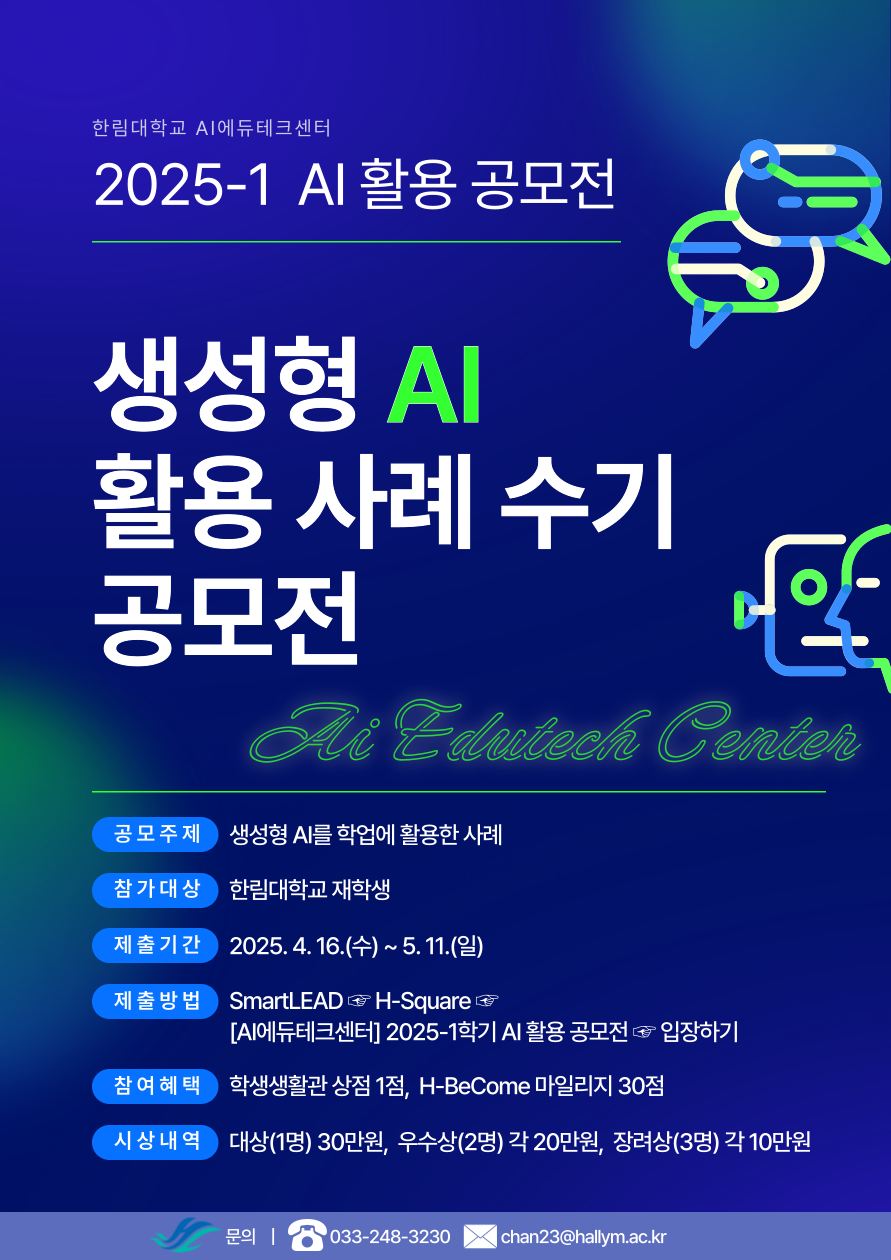 AI에듀테크센터에서 진행하는 '2025-1학기 생성형 AI 활용 사례 수기 공모전' 안내 드립니다.