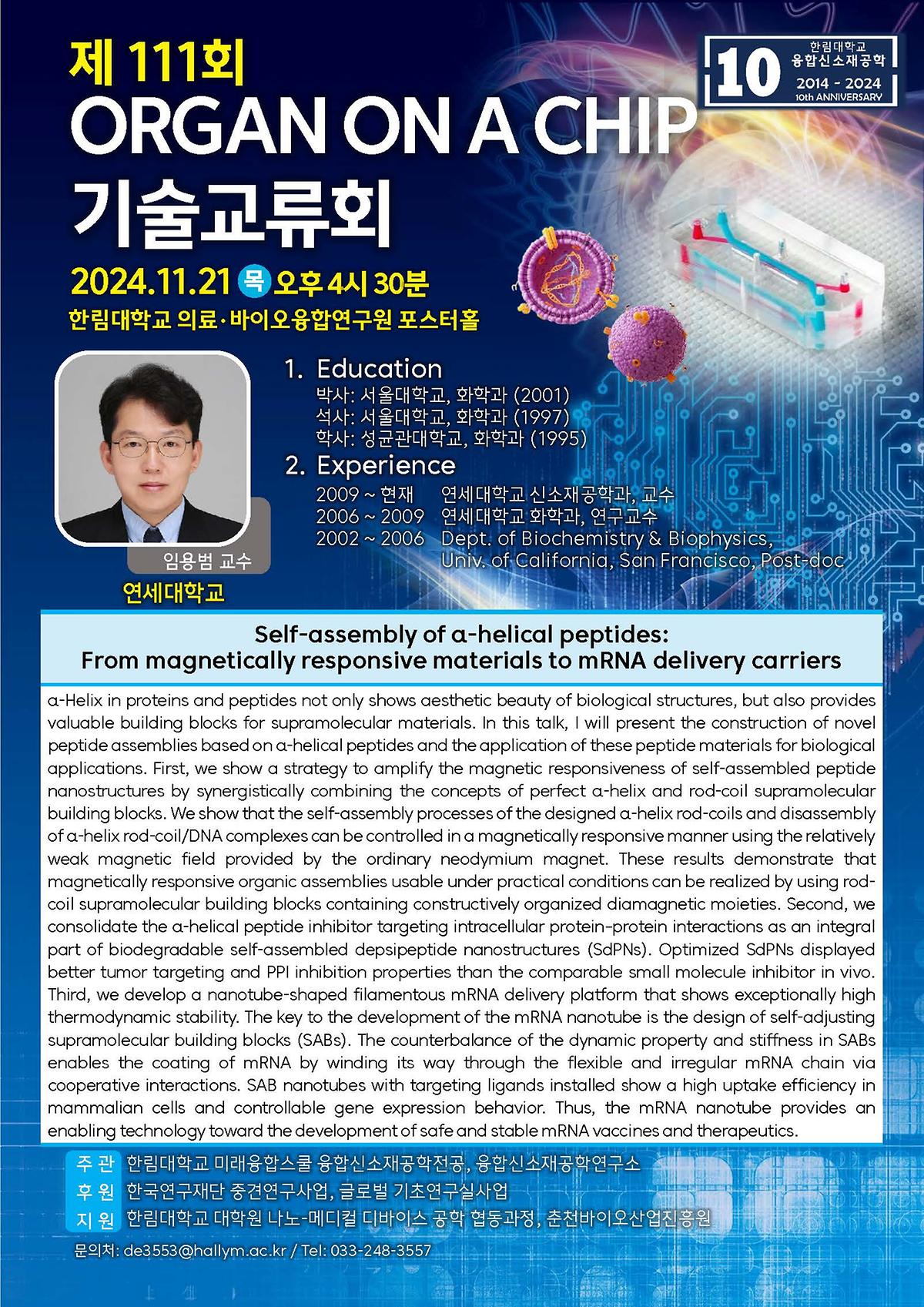 이번 기술교류회에서는 연세대 임용범 교수를 연사로 모시고 'Self-assembly of α-helical peptides: From magnetically responsive materials to mRNA delivery carriers' 를 주제로 강연이 진행되었다.