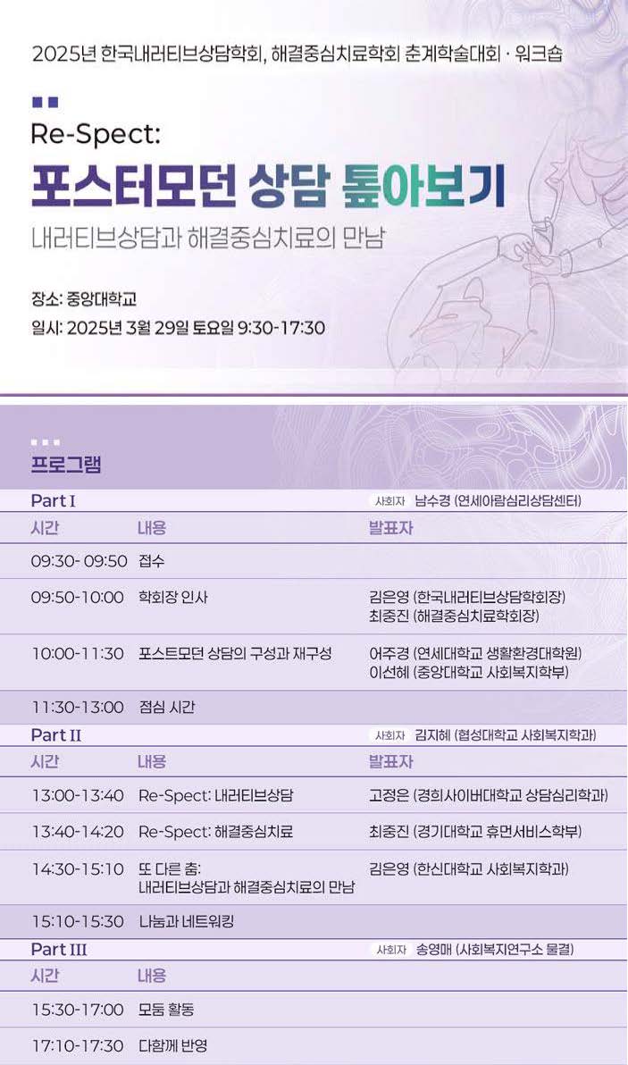 [워크숍] 2025년 춘계학술대회 '포스트모던 상담 톺아보기' -한국내러티브상담학회, 해결중심치료학회 공동
