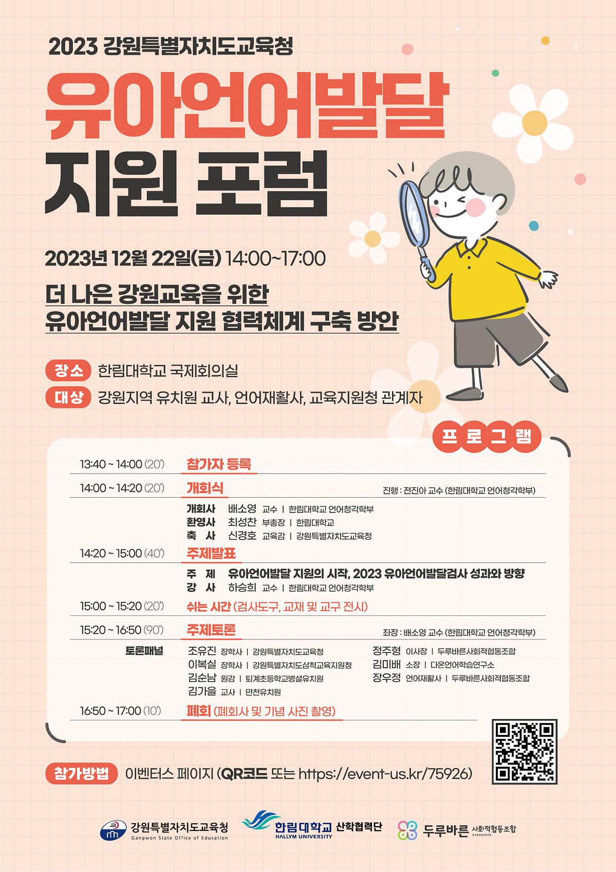 □ 강원특별자치도교육청(교육감 신경호)은 22일(금) 한림대학교 국제회의실에서 △한림대학교(총장 최양희) 산학협력단(단장 강일준) △두루바른사회적협동조합(이사장 정주형)과 공동으로 주최하는 ‘2023 유아언어발달 지원 포럼’을 개최한다고 밝혔습니다.